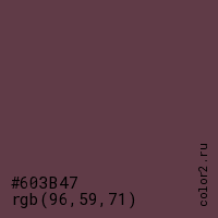 Цвет #603B47 в цветовой модели RGB обозначается тремя октетами (96, 59, 71) в десятичном формате и #603B47 в шестнадцатиричном (hex) формате, которые являются интенсивностью красного 96 (hex 60), интенсивность зелёного 59 (hex 3B) и интенсивность синего 71 (hex 47).