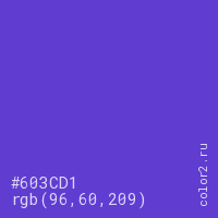 Цвет #603CD1 в цветовой модели RGB обозначается тремя октетами (96, 60, 209) в десятичном формате и #603CD1 в шестнадцатиричном (hex) формате, которые являются интенсивностью красного 96 (hex 60), интенсивность зелёного 60 (hex 3C) и интенсивность синего 209 (hex D1).