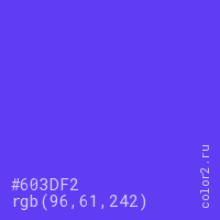 Цвет #603DF2 в цветовой модели RGB обозначается тремя октетами (96, 61, 242) в десятичном формате и #603DF2 в шестнадцатиричном (hex) формате, которые являются интенсивностью красного 96 (hex 60), интенсивность зелёного 61 (hex 3D) и интенсивность синего 242 (hex F2).