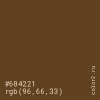 Цвет #604221 в цветовой модели RGB обозначается тремя октетами (96, 66, 33) в десятичном формате и #604221 в шестнадцатиричном (hex) формате, которые являются интенсивностью красного 96 (hex 60), интенсивность зелёного 66 (hex 42) и интенсивность синего 33 (hex 21).