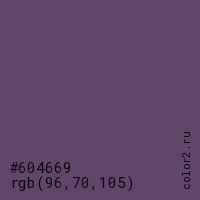 Цвет #604669 в цветовой модели RGB обозначается тремя октетами (96, 70, 105) в десятичном формате и #604669 в шестнадцатиричном (hex) формате, которые являются интенсивностью красного 96 (hex 60), интенсивность зелёного 70 (hex 46) и интенсивность синего 105 (hex 69).