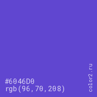 Цвет #6046D0 в цветовой модели RGB обозначается тремя октетами (96, 70, 208) в десятичном формате и #6046D0 в шестнадцатиричном (hex) формате, которые являются интенсивностью красного 96 (hex 60), интенсивность зелёного 70 (hex 46) и интенсивность синего 208 (hex D0).
