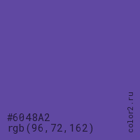 Цвет #6048A2 в цветовой модели RGB обозначается тремя октетами (96, 72, 162) в десятичном формате и #6048A2 в шестнадцатиричном (hex) формате, которые являются интенсивностью красного 96 (hex 60), интенсивность зелёного 72 (hex 48) и интенсивность синего 162 (hex A2).