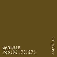 Цвет #604B1B в цветовой модели RGB обозначается тремя октетами (96, 75, 27) в десятичном формате и #604B1B в шестнадцатиричном (hex) формате, которые являются интенсивностью красного 96 (hex 60), интенсивность зелёного 75 (hex 4B) и интенсивность синего 27 (hex 1B).