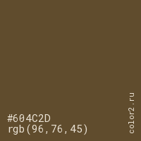 Цвет #604C2D в цветовой модели RGB обозначается тремя октетами (96, 76, 45) в десятичном формате и #604C2D в шестнадцатиричном (hex) формате, которые являются интенсивностью красного 96 (hex 60), интенсивность зелёного 76 (hex 4C) и интенсивность синего 45 (hex 2D).