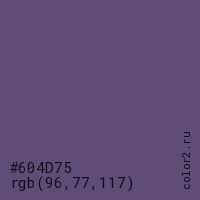 Цвет #604D75 в цветовой модели RGB обозначается тремя октетами (96, 77, 117) в десятичном формате и #604D75 в шестнадцатиричном (hex) формате, которые являются интенсивностью красного 96 (hex 60), интенсивность зелёного 77 (hex 4D) и интенсивность синего 117 (hex 75).
