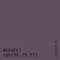 Цвет #604F61 в цветовой модели RGB обозначается тремя октетами (96, 79, 97) в десятичном формате и #604F61 в шестнадцатиричном (hex) формате, которые являются интенсивностью красного 96 (hex 60), интенсивность зелёного 79 (hex 4F) и интенсивность синего 97 (hex 61).