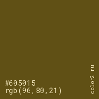 Цвет #605015 в цветовой модели RGB обозначается тремя октетами (96, 80, 21) в десятичном формате и #605015 в шестнадцатиричном (hex) формате, которые являются интенсивностью красного 96 (hex 60), интенсивность зелёного 80 (hex 50) и интенсивность синего 21 (hex 15).