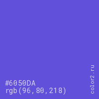 Цвет #6050DA в цветовой модели RGB обозначается тремя октетами (96, 80, 218) в десятичном формате и #6050DA в шестнадцатиричном (hex) формате, которые являются интенсивностью красного 96 (hex 60), интенсивность зелёного 80 (hex 50) и интенсивность синего 218 (hex DA).
