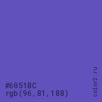Цвет #6051BC в цветовой модели RGB обозначается тремя октетами (96, 81, 188) в десятичном формате и #6051BC в шестнадцатиричном (hex) формате, которые являются интенсивностью красного 96 (hex 60), интенсивность зелёного 81 (hex 51) и интенсивность синего 188 (hex BC).