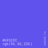 Цвет #6052EC в цветовой модели RGB обозначается тремя октетами (96, 82, 236) в десятичном формате и #6052EC в шестнадцатиричном (hex) формате, которые являются интенсивностью красного 96 (hex 60), интенсивность зелёного 82 (hex 52) и интенсивность синего 236 (hex EC).