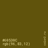Цвет #60530C в цветовой модели RGB обозначается тремя октетами (96, 83, 12) в десятичном формате и #60530C в шестнадцатиричном (hex) формате, которые являются интенсивностью красного 96 (hex 60), интенсивность зелёного 83 (hex 53) и интенсивность синего 12 (hex 0C).