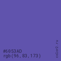 Цвет #6053AD в цветовой модели RGB обозначается тремя октетами (96, 83, 173) в десятичном формате и #6053AD в шестнадцатиричном (hex) формате, которые являются интенсивностью красного 96 (hex 60), интенсивность зелёного 83 (hex 53) и интенсивность синего 173 (hex AD).