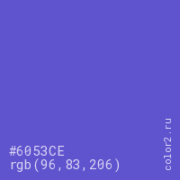 Цвет #6053CE в цветовой модели RGB обозначается тремя октетами (96, 83, 206) в десятичном формате и #6053CE в шестнадцатиричном (hex) формате, которые являются интенсивностью красного 96 (hex 60), интенсивность зелёного 83 (hex 53) и интенсивность синего 206 (hex CE).