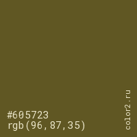 Цвет #605723 в цветовой модели RGB обозначается тремя октетами (96, 87, 35) в десятичном формате и #605723 в шестнадцатиричном (hex) формате, которые являются интенсивностью красного 96 (hex 60), интенсивность зелёного 87 (hex 57) и интенсивность синего 35 (hex 23).