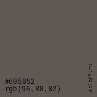 Цвет #605852 в цветовой модели RGB обозначается тремя октетами (96, 88, 82) в десятичном формате и #605852 в шестнадцатиричном (hex) формате, которые являются интенсивностью красного 96 (hex 60), интенсивность зелёного 88 (hex 58) и интенсивность синего 82 (hex 52).