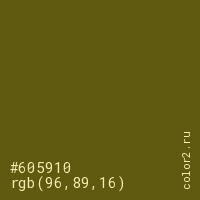 Цвет #605910 в цветовой модели RGB обозначается тремя октетами (96, 89, 16) в десятичном формате и #605910 в шестнадцатиричном (hex) формате, которые являются интенсивностью красного 96 (hex 60), интенсивность зелёного 89 (hex 59) и интенсивность синего 16 (hex 10).