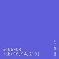 Цвет #605EDB в цветовой модели RGB обозначается тремя октетами (96, 94, 219) в десятичном формате и #605EDB в шестнадцатиричном (hex) формате, которые являются интенсивностью красного 96 (hex 60), интенсивность зелёного 94 (hex 5E) и интенсивность синего 219 (hex DB).
