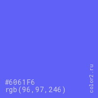 Цвет #6061F6 в цветовой модели RGB обозначается тремя октетами (96, 97, 246) в десятичном формате и #6061F6 в шестнадцатиричном (hex) формате, которые являются интенсивностью красного 96 (hex 60), интенсивность зелёного 97 (hex 61) и интенсивность синего 246 (hex F6).
