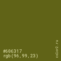 Цвет #606317 в цветовой модели RGB обозначается тремя октетами (96, 99, 23) в десятичном формате и #606317 в шестнадцатиричном (hex) формате, которые являются интенсивностью красного 96 (hex 60), интенсивность зелёного 99 (hex 63) и интенсивность синего 23 (hex 17).