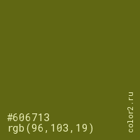 Цвет #606713 в цветовой модели RGB обозначается тремя октетами (96, 103, 19) в десятичном формате и #606713 в шестнадцатиричном (hex) формате, которые являются интенсивностью красного 96 (hex 60), интенсивность зелёного 103 (hex 67) и интенсивность синего 19 (hex 13).