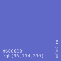 Цвет #6068C8 в цветовой модели RGB обозначается тремя октетами (96, 104, 200) в десятичном формате и #6068C8 в шестнадцатиричном (hex) формате, которые являются интенсивностью красного 96 (hex 60), интенсивность зелёного 104 (hex 68) и интенсивность синего 200 (hex C8).