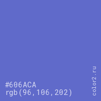 Цвет #606ACA в цветовой модели RGB обозначается тремя октетами (96, 106, 202) в десятичном формате и #606ACA в шестнадцатиричном (hex) формате, которые являются интенсивностью красного 96 (hex 60), интенсивность зелёного 106 (hex 6A) и интенсивность синего 202 (hex CA).