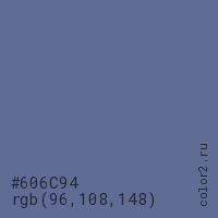 Цвет #606C94 в цветовой модели RGB обозначается тремя октетами (96, 108, 148) в десятичном формате и #606C94 в шестнадцатиричном (hex) формате, которые являются интенсивностью красного 96 (hex 60), интенсивность зелёного 108 (hex 6C) и интенсивность синего 148 (hex 94).
