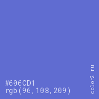 Цвет #606CD1 в цветовой модели RGB обозначается тремя октетами (96, 108, 209) в десятичном формате и #606CD1 в шестнадцатиричном (hex) формате, которые являются интенсивностью красного 96 (hex 60), интенсивность зелёного 108 (hex 6C) и интенсивность синего 209 (hex D1).