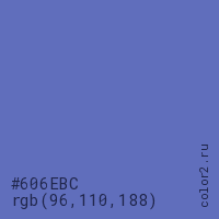 Цвет #606EBC в цветовой модели RGB обозначается тремя октетами (96, 110, 188) в десятичном формате и #606EBC в шестнадцатиричном (hex) формате, которые являются интенсивностью красного 96 (hex 60), интенсивность зелёного 110 (hex 6E) и интенсивность синего 188 (hex BC).