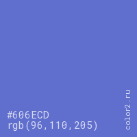 Цвет #606ECD в цветовой модели RGB обозначается тремя октетами (96, 110, 205) в десятичном формате и #606ECD в шестнадцатиричном (hex) формате, которые являются интенсивностью красного 96 (hex 60), интенсивность зелёного 110 (hex 6E) и интенсивность синего 205 (hex CD).