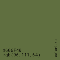 Цвет #606F40 в цветовой модели RGB обозначается тремя октетами (96, 111, 64) в десятичном формате и #606F40 в шестнадцатиричном (hex) формате, которые являются интенсивностью красного 96 (hex 60), интенсивность зелёного 111 (hex 6F) и интенсивность синего 64 (hex 40).