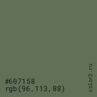 Цвет #607158 в цветовой модели RGB обозначается тремя октетами (96, 113, 88) в десятичном формате и #607158 в шестнадцатиричном (hex) формате, которые являются интенсивностью красного 96 (hex 60), интенсивность зелёного 113 (hex 71) и интенсивность синего 88 (hex 58).