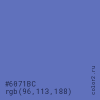 Цвет #6071BC в цветовой модели RGB обозначается тремя октетами (96, 113, 188) в десятичном формате и #6071BC в шестнадцатиричном (hex) формате, которые являются интенсивностью красного 96 (hex 60), интенсивность зелёного 113 (hex 71) и интенсивность синего 188 (hex BC).