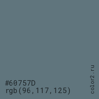 Цвет #60757D в цветовой модели RGB обозначается тремя октетами (96, 117, 125) в десятичном формате и #60757D в шестнадцатиричном (hex) формате, которые являются интенсивностью красного 96 (hex 60), интенсивность зелёного 117 (hex 75) и интенсивность синего 125 (hex 7D).