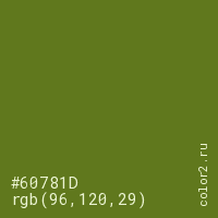 Цвет #60781D в цветовой модели RGB обозначается тремя октетами (96, 120, 29) в десятичном формате и #60781D в шестнадцатиричном (hex) формате, которые являются интенсивностью красного 96 (hex 60), интенсивность зелёного 120 (hex 78) и интенсивность синего 29 (hex 1D).