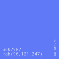 Цвет #6079F7 в цветовой модели RGB обозначается тремя октетами (96, 121, 247) в десятичном формате и #6079F7 в шестнадцатиричном (hex) формате, которые являются интенсивностью красного 96 (hex 60), интенсивность зелёного 121 (hex 79) и интенсивность синего 247 (hex F7).