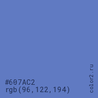 Цвет #607AC2 в цветовой модели RGB обозначается тремя октетами (96, 122, 194) в десятичном формате и #607AC2 в шестнадцатиричном (hex) формате, которые являются интенсивностью красного 96 (hex 60), интенсивность зелёного 122 (hex 7A) и интенсивность синего 194 (hex C2).