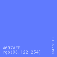 Цвет #607AFE в цветовой модели RGB обозначается тремя октетами (96, 122, 254) в десятичном формате и #607AFE в шестнадцатиричном (hex) формате, которые являются интенсивностью красного 96 (hex 60), интенсивность зелёного 122 (hex 7A) и интенсивность синего 254 (hex FE).