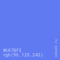 Цвет #607BF2 в цветовой модели RGB обозначается тремя октетами (96, 123, 242) в десятичном формате и #607BF2 в шестнадцатиричном (hex) формате, которые являются интенсивностью красного 96 (hex 60), интенсивность зелёного 123 (hex 7B) и интенсивность синего 242 (hex F2).