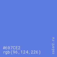 Цвет #607CE2 в цветовой модели RGB обозначается тремя октетами (96, 124, 226) в десятичном формате и #607CE2 в шестнадцатиричном (hex) формате, которые являются интенсивностью красного 96 (hex 60), интенсивность зелёного 124 (hex 7C) и интенсивность синего 226 (hex E2).