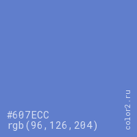 Цвет #607ECC в цветовой модели RGB обозначается тремя октетами (96, 126, 204) в десятичном формате и #607ECC в шестнадцатиричном (hex) формате, которые являются интенсивностью красного 96 (hex 60), интенсивность зелёного 126 (hex 7E) и интенсивность синего 204 (hex CC).