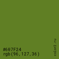 Цвет #607F24 в цветовой модели RGB обозначается тремя октетами (96, 127, 36) в десятичном формате и #607F24 в шестнадцатиричном (hex) формате, которые являются интенсивностью красного 96 (hex 60), интенсивность зелёного 127 (hex 7F) и интенсивность синего 36 (hex 24).
