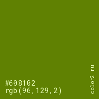 Цвет #608102 в цветовой модели RGB обозначается тремя октетами (96, 129, 2) в десятичном формате и #608102 в шестнадцатиричном (hex) формате, которые являются интенсивностью красного 96 (hex 60), интенсивность зелёного 129 (hex 81) и интенсивность синего 2 (hex 02).