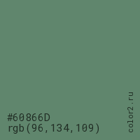 Цвет #60866D в цветовой модели RGB обозначается тремя октетами (96, 134, 109) в десятичном формате и #60866D в шестнадцатиричном (hex) формате, которые являются интенсивностью красного 96 (hex 60), интенсивность зелёного 134 (hex 86) и интенсивность синего 109 (hex 6D).