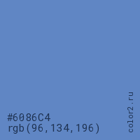 Цвет #6086C4 в цветовой модели RGB обозначается тремя октетами (96, 134, 196) в десятичном формате и #6086C4 в шестнадцатиричном (hex) формате, которые являются интенсивностью красного 96 (hex 60), интенсивность зелёного 134 (hex 86) и интенсивность синего 196 (hex C4).