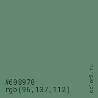 Цвет #608970 в цветовой модели RGB обозначается тремя октетами (96, 137, 112) в десятичном формате и #608970 в шестнадцатиричном (hex) формате, которые являются интенсивностью красного 96 (hex 60), интенсивность зелёного 137 (hex 89) и интенсивность синего 112 (hex 70).