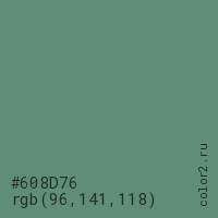 Цвет #608D76 в цветовой модели RGB обозначается тремя октетами (96, 141, 118) в десятичном формате и #608D76 в шестнадцатиричном (hex) формате, которые являются интенсивностью красного 96 (hex 60), интенсивность зелёного 141 (hex 8D) и интенсивность синего 118 (hex 76).