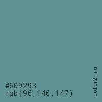 Цвет #609293 в цветовой модели RGB обозначается тремя октетами (96, 146, 147) в десятичном формате и #609293 в шестнадцатиричном (hex) формате, которые являются интенсивностью красного 96 (hex 60), интенсивность зелёного 146 (hex 92) и интенсивность синего 147 (hex 93).