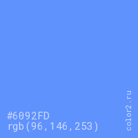 Цвет #6092FD в цветовой модели RGB обозначается тремя октетами (96, 146, 253) в десятичном формате и #6092FD в шестнадцатиричном (hex) формате, которые являются интенсивностью красного 96 (hex 60), интенсивность зелёного 146 (hex 92) и интенсивность синего 253 (hex FD).